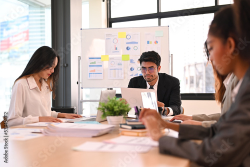 Group of professional businesspeople sitting in conference room and discuss financial paperwork