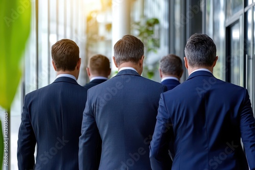 Group of professional men dressed in suits engaged in discussion inside a modern office space with collaborative energy