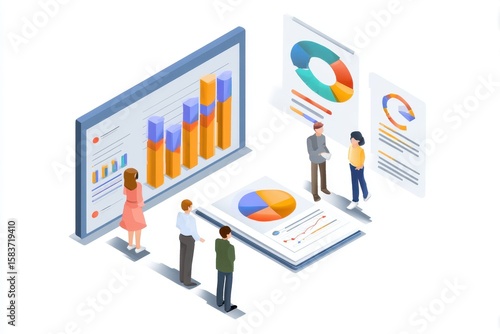 Group of professionals discussing a business presentation data report with visuals and charts in an office setting