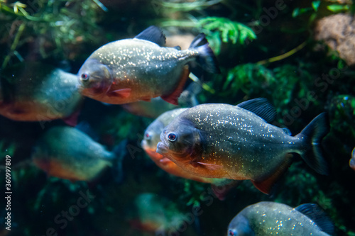 Group of red-bellied piranhas are swimming, bright, stock photo fish in natural conditions