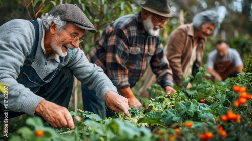 Group of senior people preparing garden space together on green rooftop garden. Sustainable living and urban agriculture. Generative ai