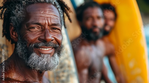 senior, group, friends, surfboard, beach, water sport, extreme, session, holding, positive, fitness, health, active, lifestyle, diverse, community