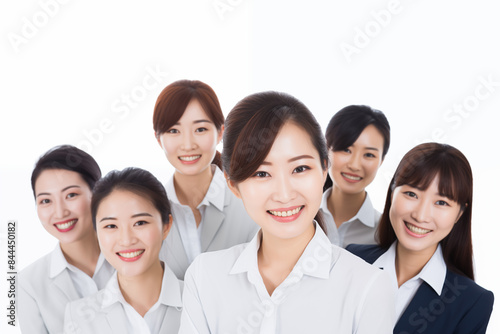 Group of smiling asian businesswomen at work on white background. Women in suits at work. Boss women. Political woman. Image for graphic designer. Business world. Job recruitment. Asia. China. Japan