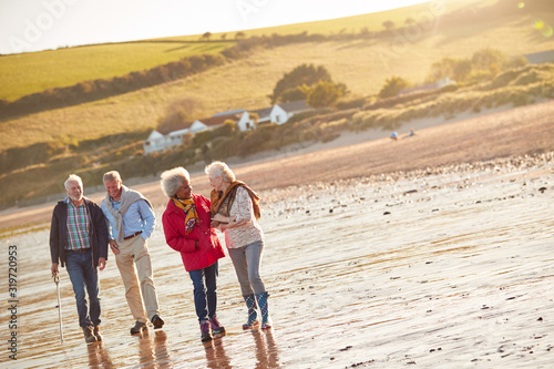 Group Of Smiling Senior Friends Walking Arm In Arm Along Shoreline Of Winter Beach