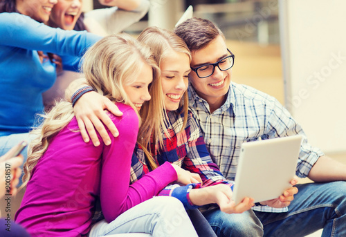 group of smiling students with tablet pc
