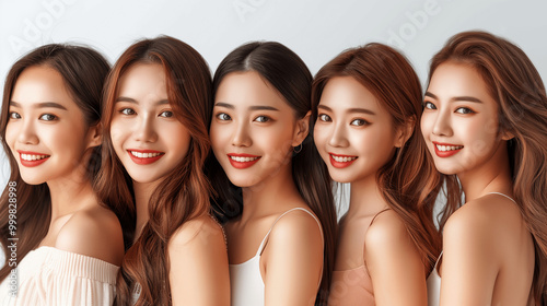 Group of smiling young Asian women standing in a row with soft makeup and long hair