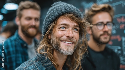 man, group, smiling, looking up, young, collaboration, inspiration, team, friendship, casual attire, urban, style, modern, positive, happy, cheerful, caucasian, beard, hat, indoor, closeup, communication, support, together, diversity, community, lifestyle, youth, fashion, trendy, confident, success, connection, people, male, attitude, cool, relaxed, daylight, meeting, event, sharing, optimistic, future, hopeful, vision