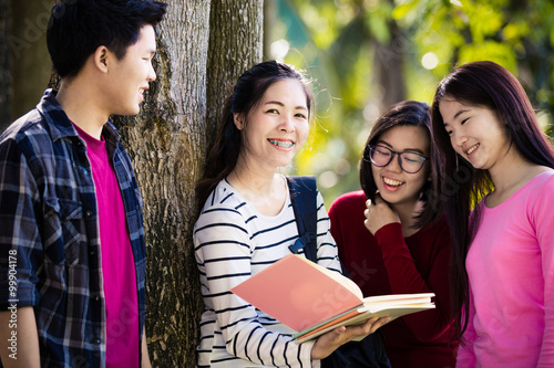 Group of students sharing with the ideas on the campus lawn