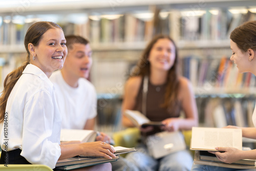 Group of students sits in the library with books, they read and prepare for exams. Classmates prepare for the thesis together