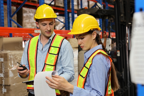Group of warehouse workers with hardhats and reflective jackets using tablet, walkie talkie radio and cardboard while controlling stock and inventory in retail warehouse logistics, distribution center