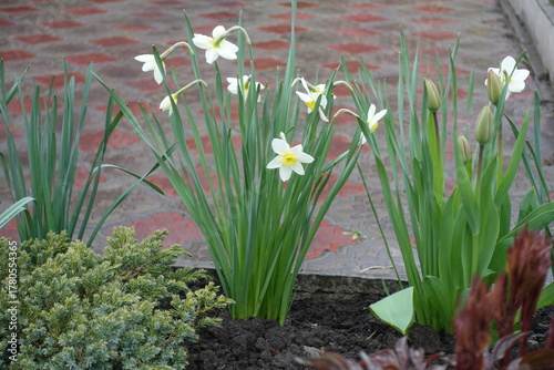 white, narcissus, flower, spring, jonquil, daffodil, nature, green, foliage, greenery, vegetation, outdoors, plant, lush, botany, vibrant, bright, ornamental, leaf, leafage, bud, inflorescence, bloom, blossom, corona, stem, scape, grassy, season, april, perennial, bulbous, park, garden, flowerbed, drop, droplet, water, rain, moist, dew