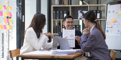 Group of young asian modern people in smart casual wear having a brainstorm meeting. Group of young asian business people discussing in the meeting.