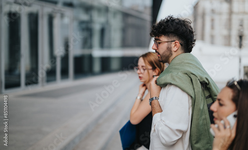 Group of young business people outdoors having a discussion near a contemporary office building. Confident and professional conversation, urban setting.