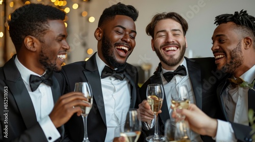 Group of young businessmen in tuxedos laughing and toasting with champagne at a luxurious corporate party,