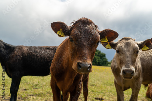 Group of young cows on the pasture being curious and approaching. Cattle standung and sitting down in different colours on the field in beautiful weather right after rain.