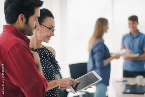 Group of young creative people are standing, working and brainstorm which looking at tablet. Team of creative co-workers planning the work. felling be happy. Co working space concept.
