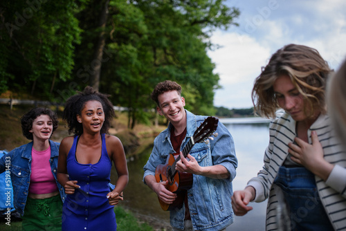 Group of young friends having fun on picnic near a lake, laughing, dancing and playing guitar.