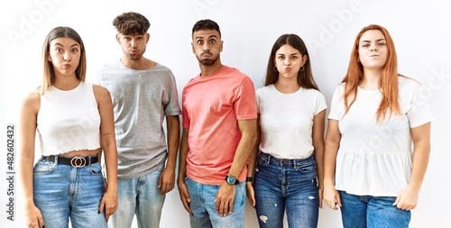 Group of young friends standing together over isolated background puffing cheeks with funny face. mouth inflated with air, crazy expression.