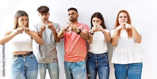 Group of young friends standing together over isolated background rejection expression crossing fingers doing negative sign