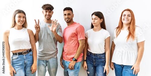 Group of young friends standing together over isolated background showing and pointing up with fingers number seven while smiling confident and happy.