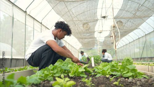 Group of young people examining lettuce plants in a greenhouse