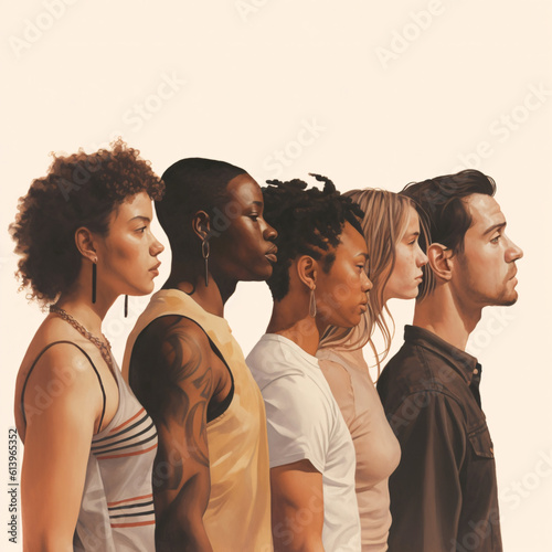 diversity, people, young, row, standing, group, together, friends, unemployed, ethnic, black, white, 30s, 20s, friendship, team, isolated, closeup, student, youth, serious, illustration, white background, student, fashion, generative, ai, man