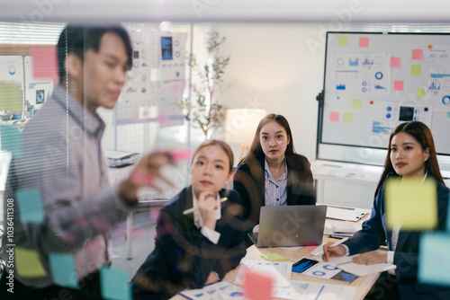 brainstorming, business, meeting, office, teamwork, team, collaboration, idea, strategy, planning, marketing, analysis, project, management, corporate, discussion, communication, innovation, creative, startup, entrepreneur, success, sticky, note, glasses, wall, technology, laptop, datum, chart, graph, asian, young, professional, group, modern, bright, natural, light, window, table, document, pen, paper