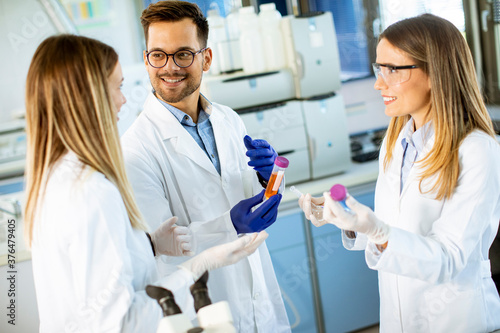 Group of young researchers analyzing chemical data in the laboratory