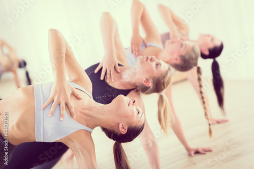 Group of young sporty attractive women in yoga studio, practicing yoga lesson with instructor. Healthy active lifestyle, working out indoors in gym