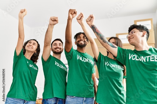 Group of young volunteers smiling happy with fists raised up at charity center.