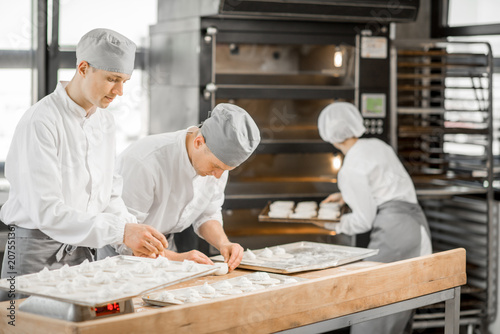 Group of young workers in uniform filling buns for baking on the wooden table standing together at the modern manufacturing