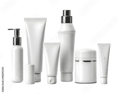 Group pile white blank cosmetic skincare container tube packaging dispenser bottle on transparent background