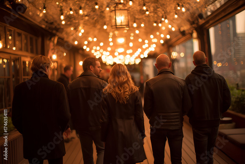 blur, out of focus, bokeh, group, man, woman, walking, together, jacket, coat, back, blond, hair, dark, warm, bright, urban, city, night, evening, light, wooden, terrace, rooftop, structure, gathering, friendship, leisure, travel, lifestyle, city landscape, silhouette, backview, low angle, perspective, moody, atmospheric, relaxation, togetherness, outing, escape, exploration, city life, gold, backlit, tour tourism, illuminated, modern