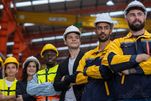 group worker factory men and women standing with confidence and success. people working in workplace of industrial heavy machine factory. young adult in career of industry of technology machinery.