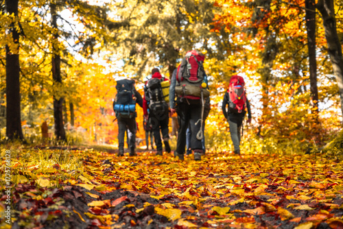 Groups of backpackers walk along a forest trail covered in colorful autumn leaves. The vibrant foliage contrasts with their gear as they enjoy the beauty of nature.