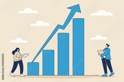 Grow business increase sales and profit, growth or progress to achieve goal and target, improve or development to boost performance concept, business people team looking at high rising up graph arrow.