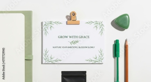 motivation, inspiration, affirmation, self-improvement, development, wellness, mindfulness, spirituality, nature, leaf, green, white background, topview, minimalist, clean, conceptual, journal, notebook, crayons, pen, stone, desk, productivity