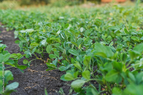 growing green beds with peanuts. rows of peanuts grow on the farm.