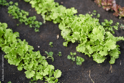 Growing green leaf lettuce on a garden bed in the garden. Green lettuce leaves on the beds in the garden. Background for gardening with green salad plants in the open ground. High quality photo