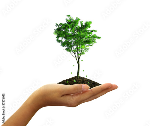Growing green tree plant in a hand isolated on white background