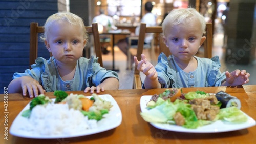 Growing up together.Twin sisters drink from sustainable cups on a break in the nursery