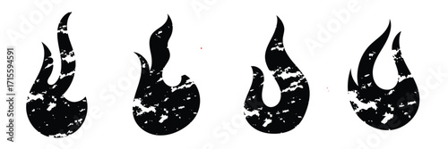 Grunge flame icons set in black. Collection of five distressed flame icons in black tones, isolated on white background, perfect for design elements. Fire flame icon.