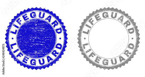 Grunge LIFEGUARD stamp seals isolated on a white background. Rosette seals with grunge texture in blue and gray colors. Vector rubber watermark of LIFEGUARD title inside round rosette.