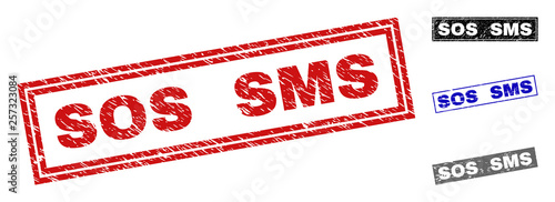 Grunge SOS SMS rectangle stamp seals isolated on a white background. Rectangular seals with grunge texture in red, blue, black and gray colors.