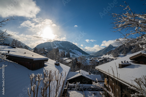 Gstaad, Switzerland - 01.01.2019: Winter view of snow covered roofs