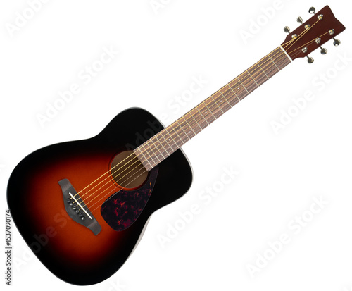 Guitar. Acoustic guitar with metal strings. Natural wooden string instrument. Musical, instrumental, equipment. Musical band. Shop musical instruments. Folk, jazz, rock instrument. Isolated background