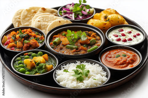 Gujarati Thali with Multiple Vegetarian Dishes on Round Plate, Traditional Style, Hyper Realistic on White Background
