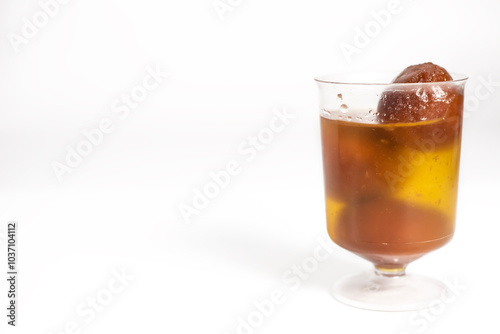 Gulab Jamun in sugar syrup in a transparent glass cup.