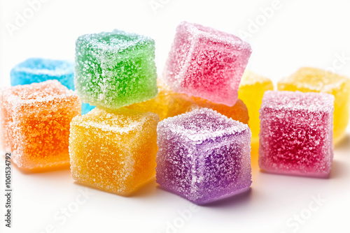 gummy isolated on white background: colorful jelly gummy cubes , gummy texture, eating gummy bear, gummy candy, eating