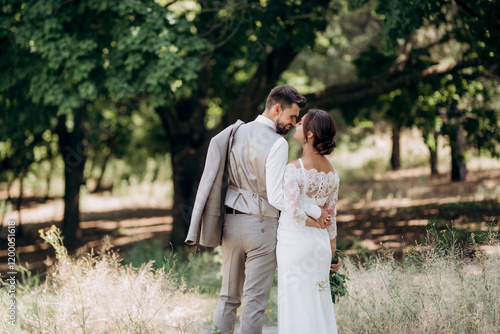 guy and a girl newlyweds are walking in the forest